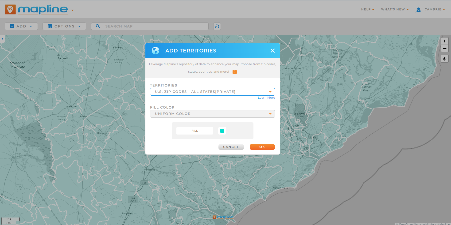 Use Mapline’s boundary features to add visual context to your map. You can overlay preloaded boundaries like counties, states, or ZIP code areas, or upload your own shapefiles for custom regions. These boundaries make it easier to identify trends, compare areas, and make your map more informative.