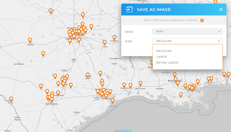 Mapline automatically generates a high-definition map image. PNG files preserve sharpness, color, and styling—ideal for slides and websites. Maps with pins, shapes, or heat maps maintain detail even when zoomed in for large screens or projection. Files are saved instantly to your device.